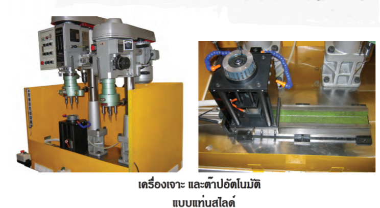 เครื่องเจาะสี่รูพร้อมกันเสร็จ สไลด์ไปต๊าปสี่รูเสร็จถอยกลับ สไลด์กลับตำแหน่งเดิม
