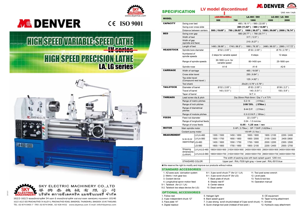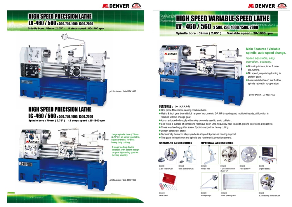 One piece Meehamite casting machine base. Metric & inch gear box with full range of inch, metric, DP, MP threading and multiple threads, all function is reached without change gear. Apron enforced oil supply with safety device is used to avoid collision. Bed ways & surface of compound rest have been ultra-frequency heat treated & ground to provide a longer life.